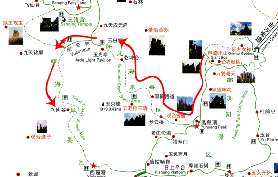 游览方式:从东部索道上,巨蟒出山(右上)——禹皇顶——步云桥——国舅悟道——乾坤台——渡仙桥——玉光亭——九天应元府,一般的玩算是与西海岸或三清福地景区串玩,单独游览较少,时间选择是在上午登山,游览到三清福地景区郁松林餐厅吃个中餐(较贵)或干粮(较便宜),稍做休整下午游览后半段游程,结束返回索道下山。